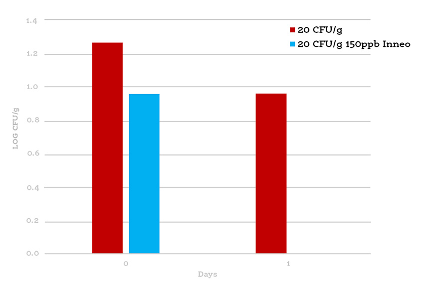 Inneo a été appliqué par pulvérisation sur les deux surfaces de filets de saumon fumé à froid à un taux standard de 150 ppb avant leur tranchage. Les échantillons témoins et traités ont été inoculés en laboratoire avec L. monocytogenes à raison de 20 UFC/g afin de simuler une contamination d’usine, puis conservés dans des conditions de réfrigération normales avant dénombrement.